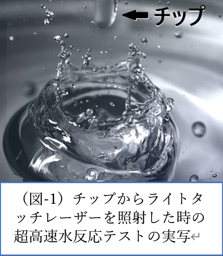 例えば、歯科用炭酸ガスレーザーは一般的に水吸収波長グラフから見て水吸収がエルビウムヤグレーザーに次いで大きな効果があると見られていますが、試しに水表面に歯科用炭酸ガスレーザーを照射しても水表面に変化は起こらず、図の2のような吸収反応は起こりません。それがなぜかはまだ解明されていませんが理論と現実技術の乖離が起きているひとつの事実と思われました。